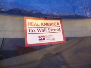 Upon arriving at the scene, we saw a sea of tents and a huge Occupy Boston banner, as shown in the picture above. The tents had various signs that read “Main Street,” “We are the 99 %,” and “Tax Wall Street.” The population of the crowd was pretty diverse and included the good, the bad, and the ugly. There were some teachers and nurses there, as well as representatives from local unions. There were also folks in tie dyed shirts and dreadlocks, and some punk rockers with black bandanas over their faces. It was also a mix of young and old.